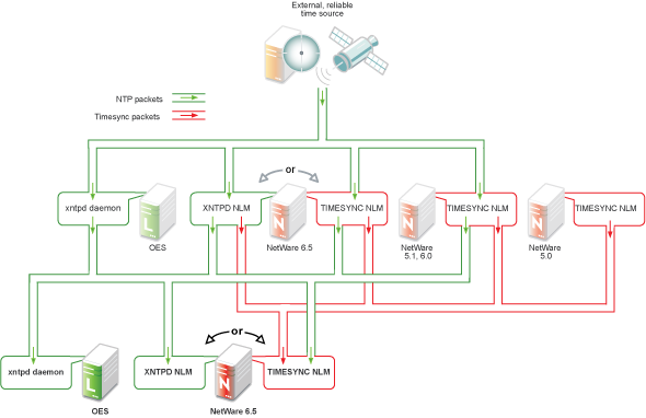 Figure 12-5 shows how OES servers can function as time providers to other OES servers and to NetWare servers, including NetWare 4.2 and later.