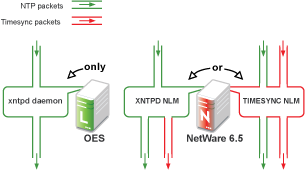As illustrated in Figure 12-1, NetWare 6.5 can use either the Network Time Protocol (NTP) or Timesync modules for time synchronization. Both modules can communicate with OES by using NTP on port 123. However, when installing virtualized NetWare, Timesync should always be used (see Section 6.22.2, Always Use Timesync Rather Than NTP).