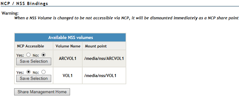 Select Manage NCP Services > Manage Shares, click NCP/NSS Bindings, then verify that the NCP Accessible parameter is turned off for the secondary volume, and turned on for the primary volume.