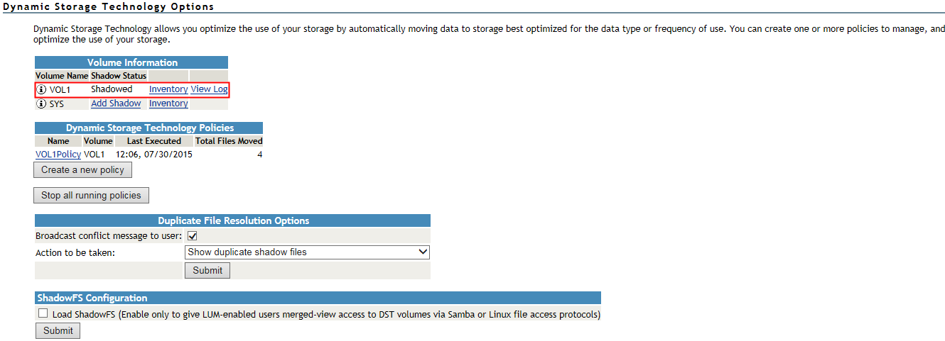 Select View File System > Dynamic Storage Technology Options, then verify that the primary volume is listed under Volume Information, and that its status is Shadowed.