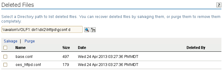 • The NSS volume must be configured for salvage in order for deleted files to be available. Enable the Salvage attribute by going to the volume’s Attributes page (Storage > Volumes > Properties > Attributes), select Salvage, then click OK.