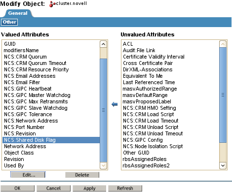 Under Valued Attributes, select the NCS: Shared Disk Flag, then click Edit.