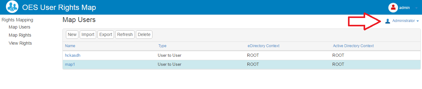 Open the OES server welcome page, then click Management Services > OES User Rights Map.