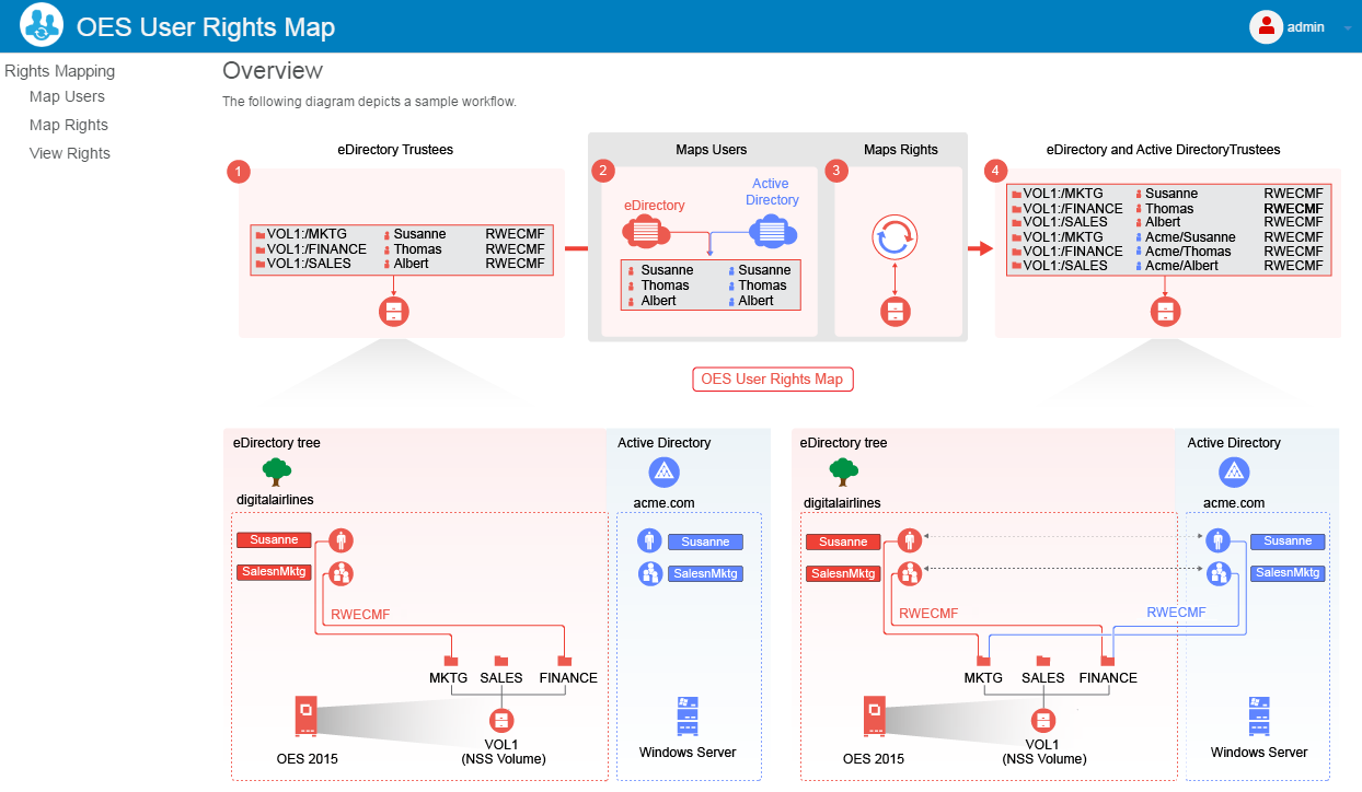 The OES User Rights Map (NURM) utility is used by administrators to map the Access Control List (ACL) of NSS resource that is owned by an identity in eDirectory to an identity in Active Directory. It maps the users and groups from eDirectory to Active Directory using a common name or any other field that is selectable by the tool. With this utility, the administrators can: