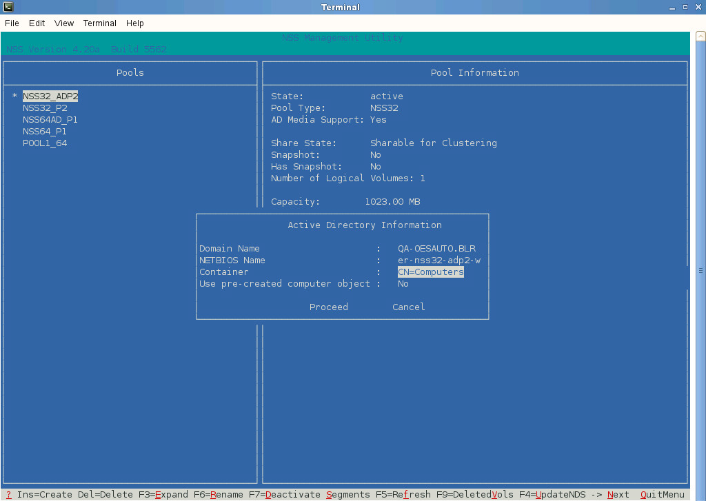 After you create a pool, you can expand it by adding free space from the same or different device to increase its size. Select from the available free space to allocate it to the pool. Each device can contribute a different amount of space to the pool. Devices that contribute space must be in the same share state as the pool, that is, Shared or Not Shared. You can increase the size of a pool, but you cannot reduce it. You can also media upgrade the pool to support AD users, and this is a one-time activity that cannot be reverted. The join cluster pool option joins a cluster pool to the AD domain. When you join, you can choose to specify the container under which the pool object will be created or you could choose to use an existing pre-created object. You can choose to perform kinit before the launch of nssmu or during AD join process. kinit during the join process is valid for only one pool join as the kdestroy is performed for every join operation. For more information, see Section 10.2.1, Joining Cluster Pools to the AD Domain. |