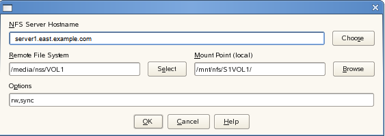 In NFS Server Hostname, specify the remote server where the volume resides. Type the fully distinguished name (such as servername.ou_context.o_context.com), or click Choose, select the NFS server from a list of servers, then click OK.