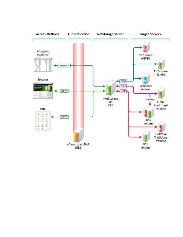 NetStorage provides secure Web access to files and folders on your OES and NetWare servers. It is a bridge between a company's protected Novell storage network and the Internet. Using a Web browser, your eDirectory users can securely copy, move, rename, delete, read, write, recover, and set trustee assignments for their files from any Internet-attached workstation, anywhere in the world, with nothing to download or install on the workstation.