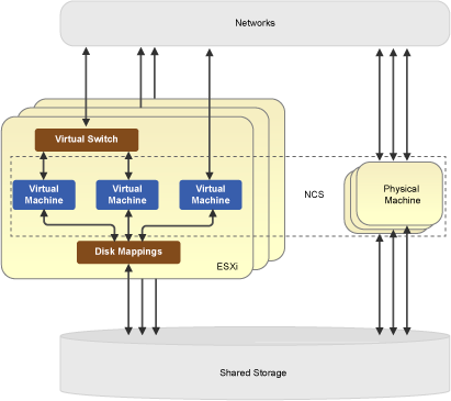 From the NCS point of view, there is no difference between a virtual machine and a physical machine. You can cluster any combination of them. Although NCS supports clustering mixtures of physical machines and virtual machines, it is easier to manage clusters where all nodes have the same or similar capacity.
