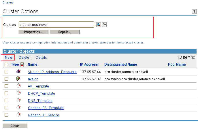 Above the Cluster objects, click New.