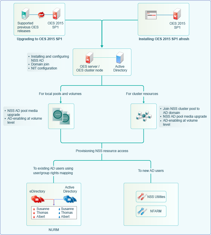 in the OES 2018 SP2: NSS File System Administration Guide for Linux. NSS AD media upgrade is required only for NSS32 bit pools, and AD-enabling of volumes must be done for both NSS32 and NSS64 pools.