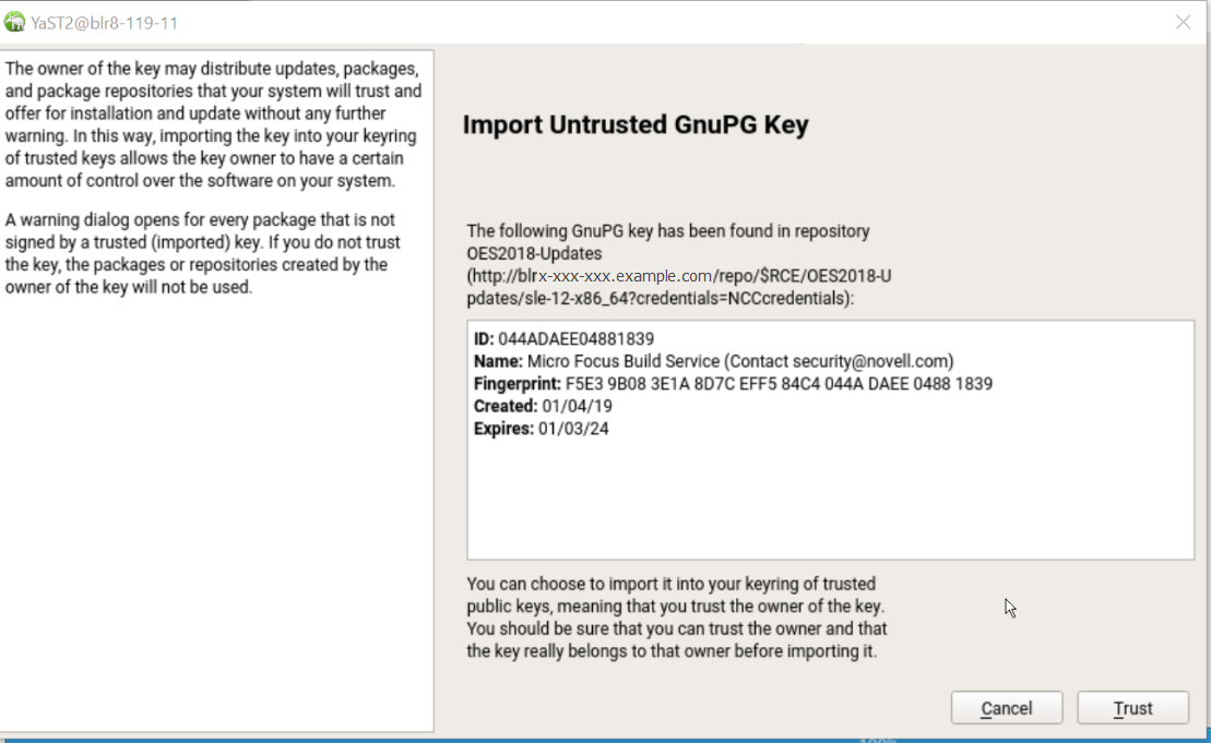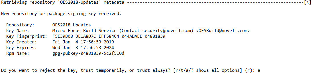 Beginning with January 2019, the OES update repository and OES packages are signed with 4096 bit key. The oes-build-key patch adds the 4096-bit key to the rpm keyring of the OES server. When this patch is applied, it displays a message to import the new keys to the keyring in the following scenarios: