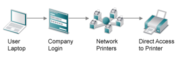 1. Olga connects her laptop to the company network, clicks the iPrint link on the company’s intranet Web page, then clicks a link for the branch office she is visiting. A map displays the branch office and the iPrint printers.