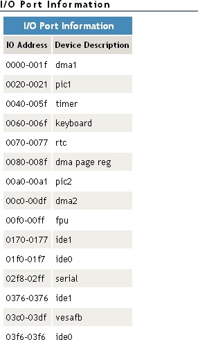 Clicking the IO Port Information link under the Manage Hardware heading in the navigation frame displays the I/O Port Information page, which includes the following: