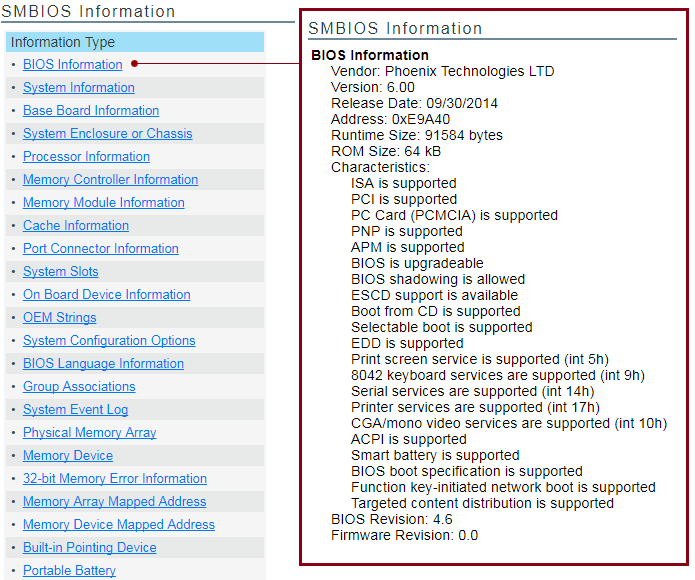 Selecting an information type displays information contained within SMBIOS for the type selected. For example, to see all the BIOS information, click the BIOS Information link. See Figure 10-5.