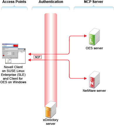 All file service access is controlled by LDAP-based authentication through the eDirectory LDAP server. |