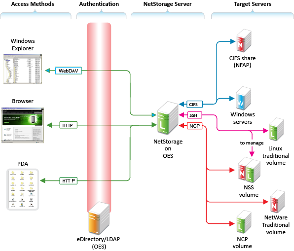 CIFS: Provides native Windows (CIFS and HTTP-WebDAV) access to files stored on an NSS volume on an OES server.