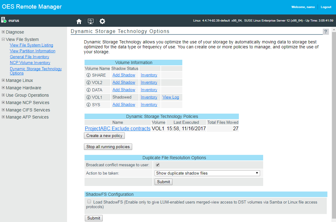 The Dynamic Storage Technology Options plug-in to OES Remote Manager for Linux allows you to create, manage, and remove shadow volume pairs built with Novell Storage Services (NSS) volumes. The plug-in is automatically installed in OES Remote Manager when you install NCP Server and Dynamic Storage Technology on your OES server.