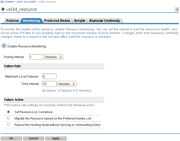 5. Specify the Failover Action by indicating whether you want the resource to be set to a comatose state, to migrate to another server, or to reboot the hosting node (without synchronizing or unmounting the disks) if a failure action initiates. The reboot option is normally used only for a mission-critical cluster resource that must remain available. .