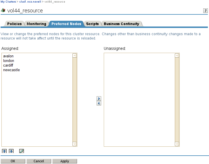 8. Click the Preferred Nodes tab, assign preferred nodes for the resource by moving them from the Unassigned list to the Assigned list, then click Apply.