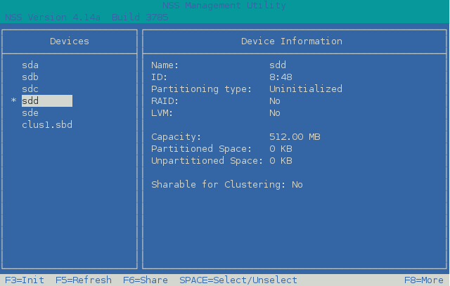 You can use NSSMU to view a list of the physical storage devices and NSS software RAID devices available to this server. Linux volumes cannot use NSS software RAID devices. NSSMU does not recognize native Linux software RAID devices.