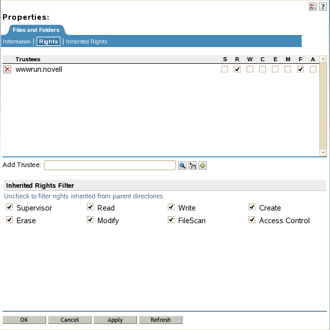 If your website is hosted on an NSS volume or an NCP-enabled Linux volume, you must assign the eDirectory user wwwrun as a file system trustee of the website’s main directory, and give the trustee Read and File Scan rights. You can also set the www group as a trustee with Read and File Scan rights.