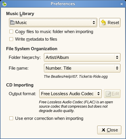 File System Organization: Lets you determine folder hierarchy in the music library and how filenames are displayed.