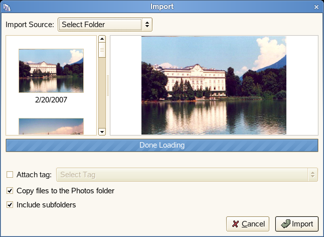 You can import photos from your hard drive or from your digital camera (see Section 16.2, Downloading Pictures from Your Camera for more information). F-Spot automatically makes copies of photos imported from your hard drive. If you don’t want to copy images, uncheck on the Import dialog box, or press Shift when dragging photos into F-Spot.
