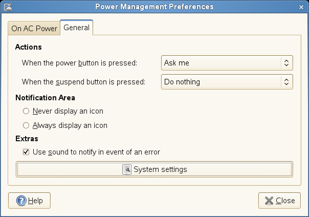 Use the options on the General Power Management Preference dialog box to configure miscellaneous options related to GNOME Power Manager’s behavior, such as the actions to perform when the power or suspend buttons are pressed, if an icon is displayed in the Notification area, and if sound is used to notify you in the event on an error.