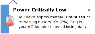When the computer has run out of power, it will show this notification explaining what action is required. You can change the critical low action using the preferences tool (see Section 1.15.3, Modifying Power Management Preferences for more information).