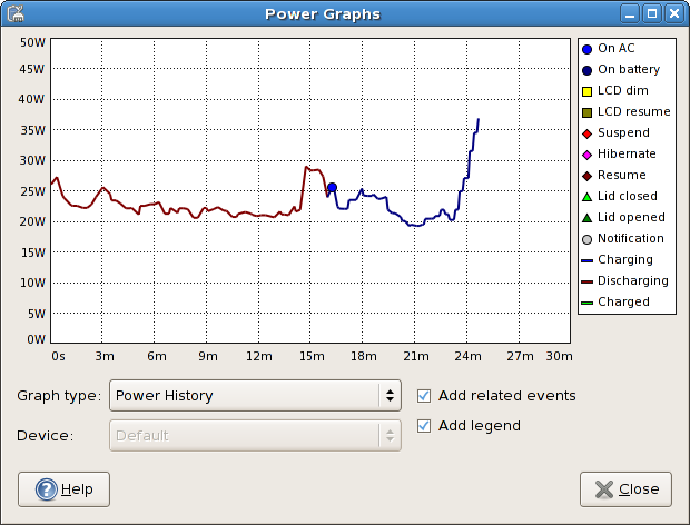 This graph shows the power history charge used by the composite primary battery. The line represents the amount of power that is either being used to charge the batteries in the system, or the power being used by the system from the batteries. You should see the line go up when processor intensive tasks are performed, and go down when the system is at idle (or when the screen is dimmed). A legend is shown with this graph when data events have been received.