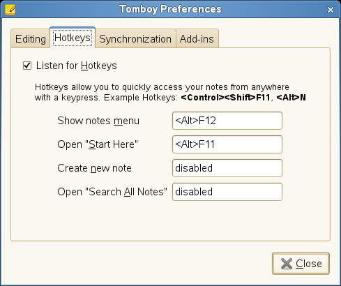 The Hotkeys tabbed page lets you set global key combinations to perform different functions in Tomboy. To set key combinations, the checkbox must be selected. Press Alt+H to toggle this option on or off.