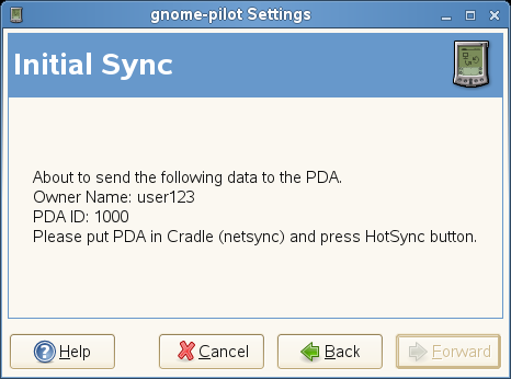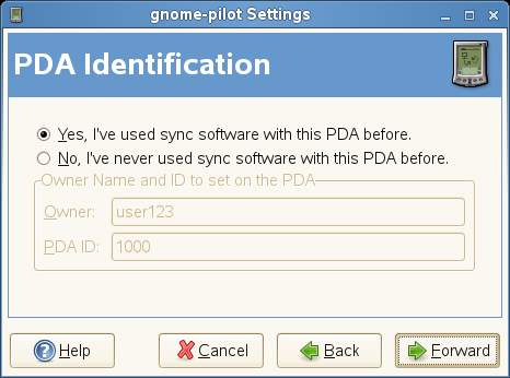 If you have previously used synchronization software with this PDA, it will already have a synchronization ID that your desktop can get from it. If you have not, you can set the username and ID on the PDA from your desktop.