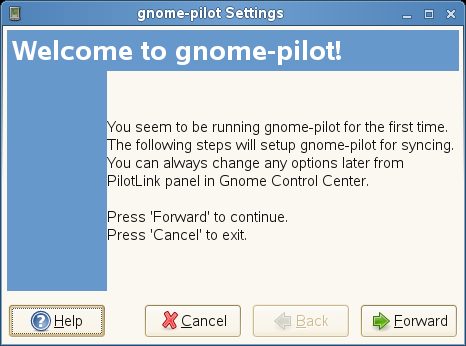 There are three tabs in the Pilot Settings tool: , , and . The first time you run the GNOME Pilot tools, you will be guided through the initial setup by an assistant.