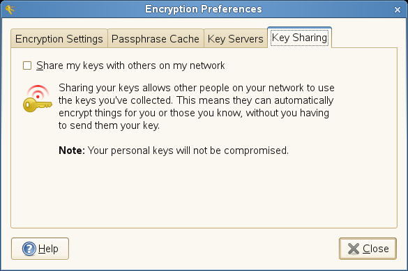 Key Sharing is provided by DNS-SD, also known as Bonjour or Rendevous. Enabling key sharing adds the local Passwords and Encryption Keys users' public key rings to the remote search dialog box. Using these local key servers is generally faster than accessing remote servers.