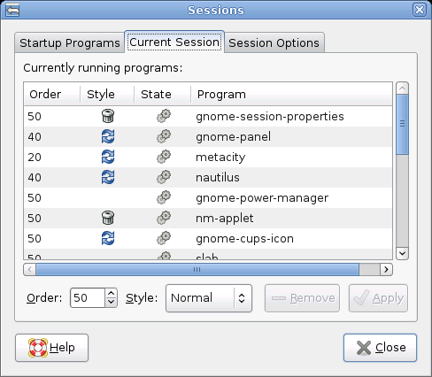 Use the Current Session tabbed page to specify startup order values and to choose restart styles for the session-managed applications in your current session.