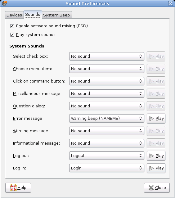 The Sound Preferences tool lets you control when the sound server starts. You can also specify which sounds to play when particular events occur.