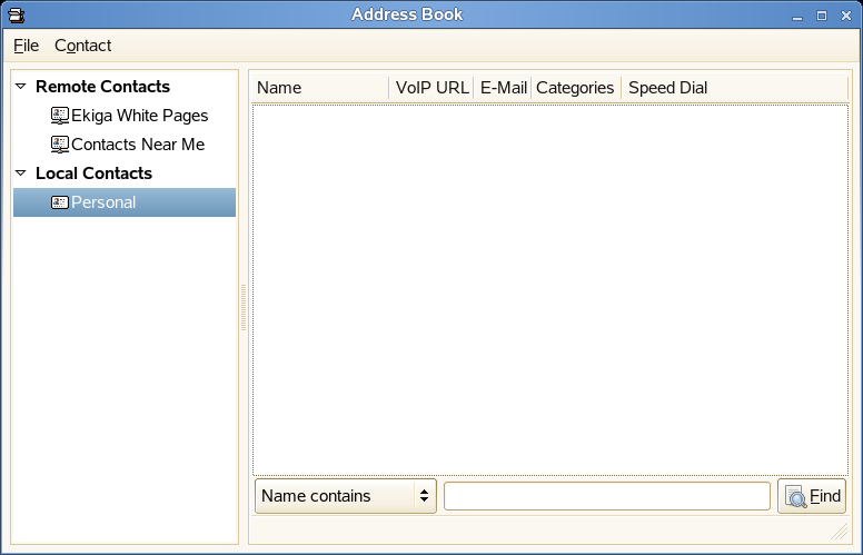 Ekiga offers to manage your SIP contacts. To open the address book, click in the Ekiga main window. An empty list window opens.