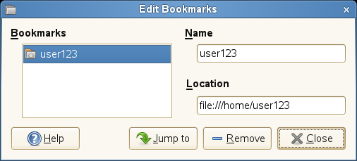 Click . The bookmark is added to the list, with the folder name as the bookmark name. When you bookmark a file, it is the folder that is actually bookmarked.