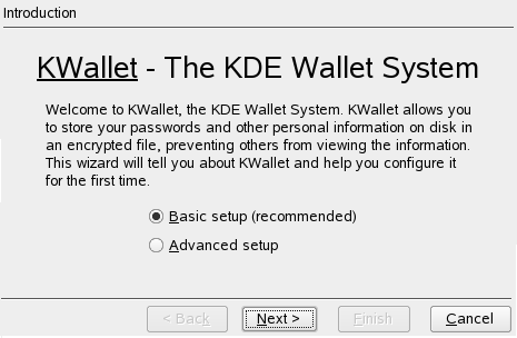 When you select the option to remember a password in a KDE application for the first time (for your e-mail account, for example), the KWallet wizard starts by default. KWallet is a password management tool that can collect all passwords and store them in an encrypted file.