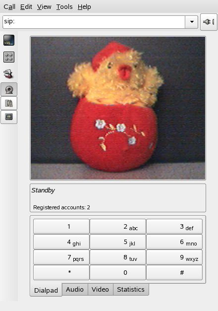 All functions of Ekiga are available via the menu bar. Shortcuts to the most important functions are provided by means of a toolbar to the left and by special key combinations.