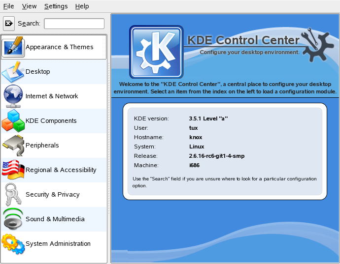 The KDE control center is the central place for users to change the overall appearance and behavior of nearly any component of the KDE desktop. Start the control center from the main menu by selecting or press Alt+F2 and enter kcontrol.