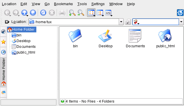 The toolbar provides quick access to frequently used functions that can also be accessed through the menu. If you hover the pointer over an icon, a short description is displayed. To the right, the toolbar features the Konqueror icon, which is animated while a directory or Web page is loaded.