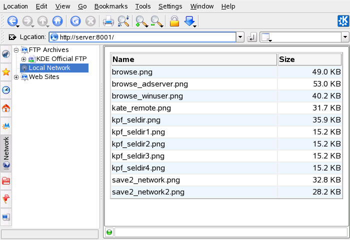 The kpf utility provides simple file sharing using HTTP (Hyper Text Transfer Protocol), which is the same protocol used by Web sites to provide data to your Web browser. kpf is strictly a public file server, which means that there are no access restrictions to shared files. Whatever you select for sharing is available to anyone.