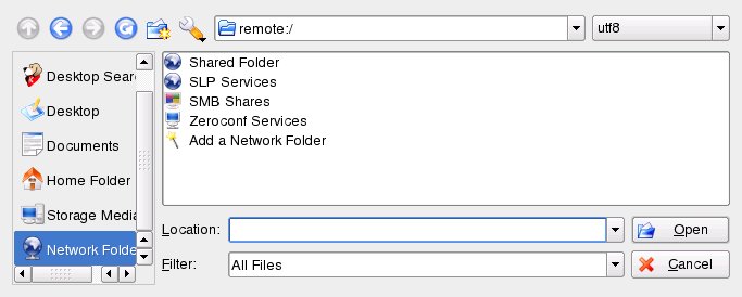 If you add a network folder in this way, you can also access this folder easily when opening or saving a file from a KDE application. If you click in the left-hand bar of an or a dialog, the network folder you added appears.