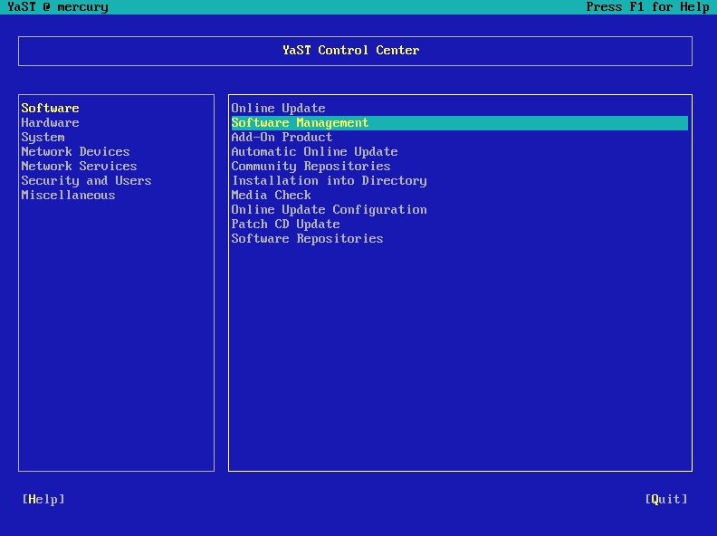 Press Enter to start the desired module. Various buttons or selection fields in the module contain a letter with a different color (yellow by default). Use Alt+yellow_letter to select a button directly instead of navigating there with Tab. Exit the YaST Control Center by pressing Alt+Q or by selecting and pressing Enter.