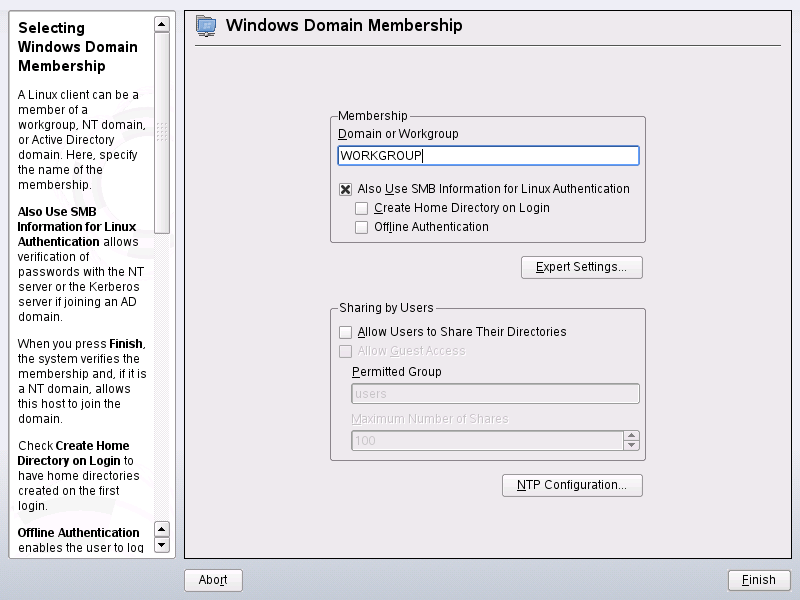 Select , if you want to change the UID and GID ranges for the Samba users and groups. Let DHCP retrieve the WINS server (default setting).