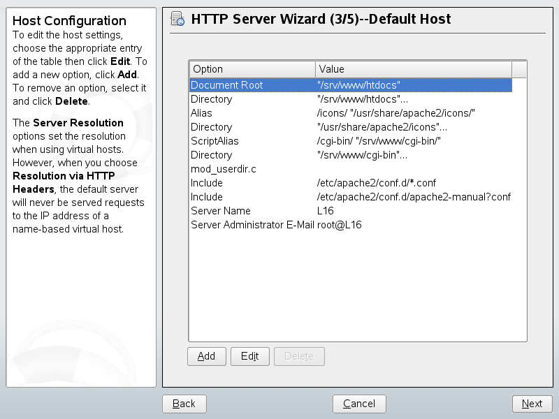 In this step, the wizard displays a list of already configured virtual hosts (see Virtual Host Configuration). If you have not made manual changes prior to starting the YaST HTTP wizard, no virtual host is present.