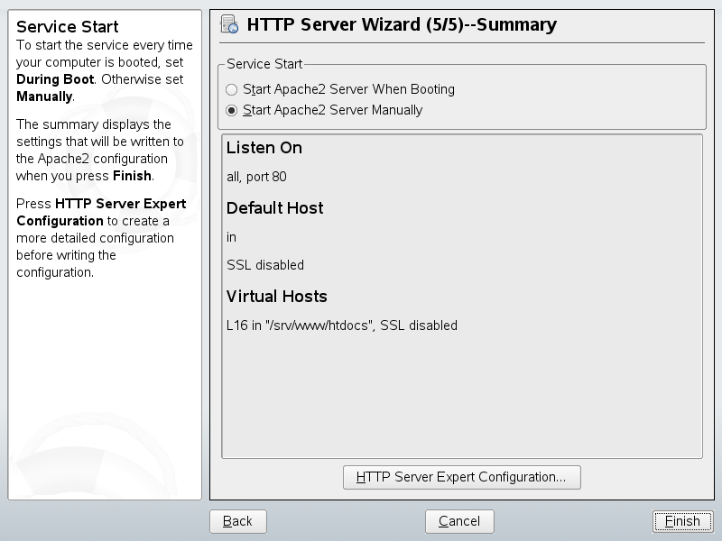 This is the final step of the wizard. Here, determine how and when the Apache server is started: when booting or manually. Also see a short summary of the configuration made so far. If you are satisfied with your settings, click to complete configuration. If you want to change something, click until you have reached the desired dialog. Clicking opens the dialog described in HTTP Server Configuration.