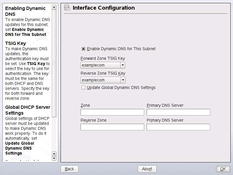 You can now activate dynamic DNS for the subnet by selecting . After doing so, use the drop-down list to choose the TSIG keys for forward and reverse zones, making sure that keys are the same for the DNS and the DHCP server. With , enable the automatic update and adjustment of the global DHCP server settings according to the dynamic DNS environment. Finally, define which forward and reverse zones should be updated per dynamic DNS, specifying the name of the primary name server for each of the two zones. If the name server runs on the same host as the DHCP server, you can leave these fields blank. Selecting returns to the subnet configuration dialog (see Figure 23-8). Selecting again returns to the original expert configuration dialog.