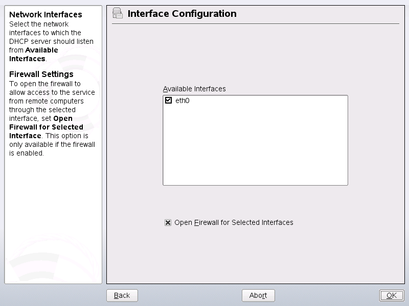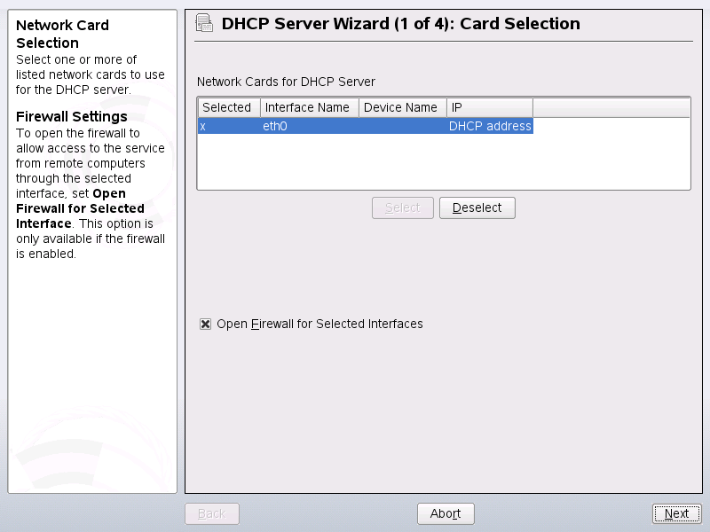 In the first step, YaST looks for the network interfaces available on your system then displays them in a list. From the list, select the interface on which the DHCP server should listen and click . After this, select to open the firewall for this interface. See Figure 23-1.